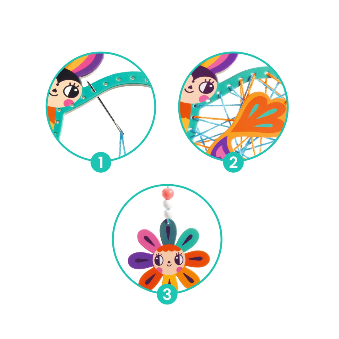 - Contains: 8 pre-punched cards, 6 bunches of string, 1 needle, 1 needle threader and 9 wooden beads.