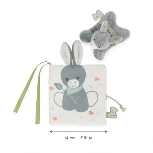 Ready for a day on the farm with Régliss' the little donkey? This fabric book is ideal for telling your baby their first stories, from birth. Before bedtime or for a moment of calm and bonding, invite your little one to explore the farm with you! To arouse baby's curiosity, stimulate their sight and touch, this picture book offers tender illustrations, a beautiful story to tell, fabrics to discover with their fingertips and fun activities. Our dear friend Régliss' the donkey travels around the farm to visit his animal friends: to bring the story to life, a little donkey cuddly toy is included with this activity book. Intensely soft, it can be used to caress baby's skin and soothe it, as well as to mime the adventures of Régliss' and make your little one laugh out loud. The other advantage of this educational toy is the pretty green ribbons which allow you to hang the fabric book anywhere, and thus let your baby enjoy it independently. You can also use them to hang the little donkey soft toy on the picture book, so you don't lose it. An ideal activity toy to stimulate baby, this fabric book measures 14 cm and is made of poplin, micro-velvet, knit and cotton. The little donkey comforter measures 11 cm, it is made of micro-velvet and synthetic fur (polyester) and padded with recycled polyester. The perfect birth gift, this baby development book invites sharing, exploration and imagination. The picture book and the plush toy are machine washable at 30°.