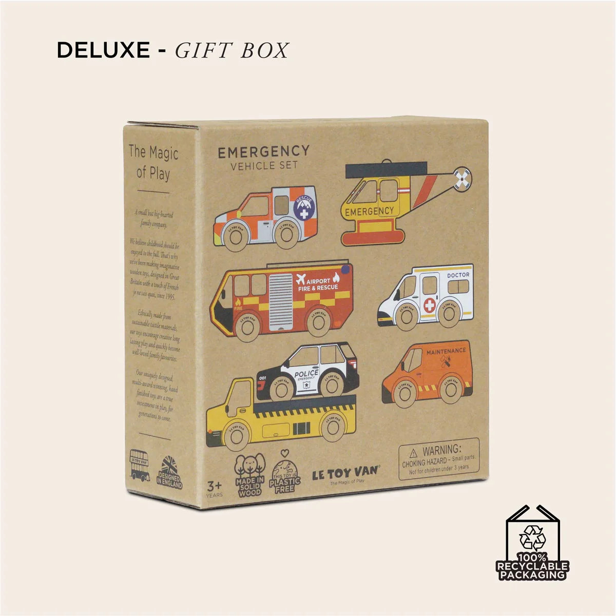 This set of 7 emergency FSC® - Certified wooden vehicles is a must-have for any little hero. Crafted with high-quality wooden wheels, these vehicles are designed to zoom seamlessly on floors or wooden train tracks for endless imaginative play. This highly detailed set includes a rescue helicopter with spinning blades, mountain rescue van, doctors' ambulance, maintenance van, airport fire engine, police SUV car, and a tow truck with its ability to hold one broken-down car - all ready to jump into action at a moment's notice.