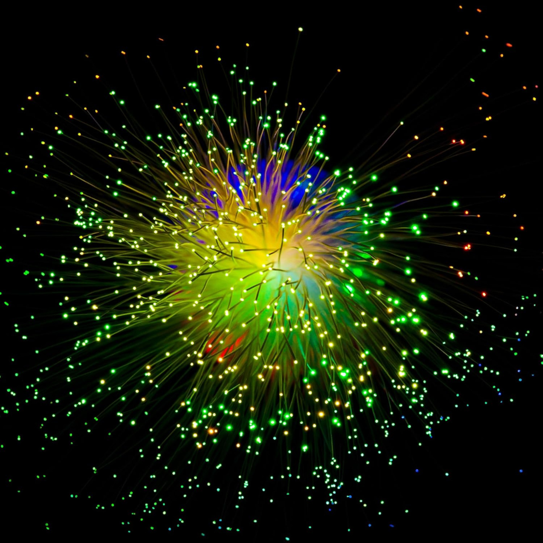 Fibre optic style light with a colour-changing base and striking blue light passes through the nylon fronds to create a galaxy of tiny stars. The base contains a collection of transparent crystal-like pieces that refract a pulse of changing light
