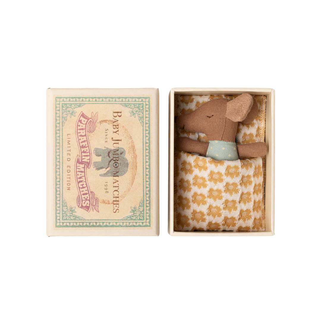 A classic Maileg item. This mouse is ready for hours of play and sleeps tight in the little matchbox. The clothes and bedlinen are made of soft fabrics with unique prints in beautiful colours.