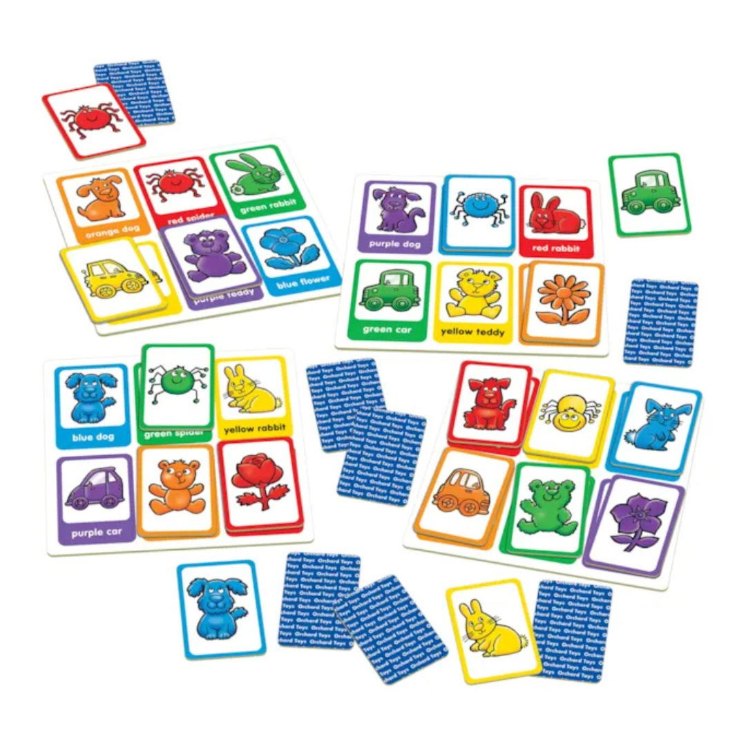 This first colour matching lotto game features fun and friendly illustrations of everyday characters and objects which children will recognise, from teddy bears to cars to bunnies. Played as a simple lotto game with each player having their own board, players are encouraged to match the bold coloured cards to the pictures on their board by both item and colour. The game features a variety of colours for children to learn and match, including red, blue, purple, green, orange and yellow. When playing with younger and older children, encourage older children to read the words of the colours aloud as well as matching the cards by colour and shape for an extra challenge.