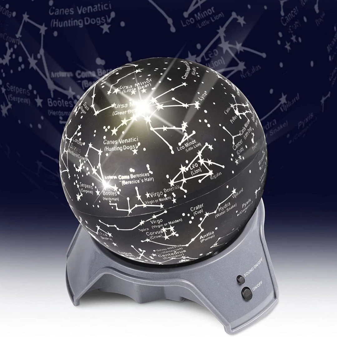 Bring the world of stargazing into your own home! Learn about the different stars and constellations in the night sky with this rotating Planetarium. Turn the lights down to watch the magical light show of stars and how they move across the night sky in our galaxy. You’ll see the patterns that the stars make with the names of these constellations clearly shown: Orion, Ursa Major (Big Bear), Pegasus (winged horse), the Zodiac constellations and many more. Using all you’ve discovered and learnt with the Planetarium, why not have fun outside finding the same constellations in the night sky where you live.