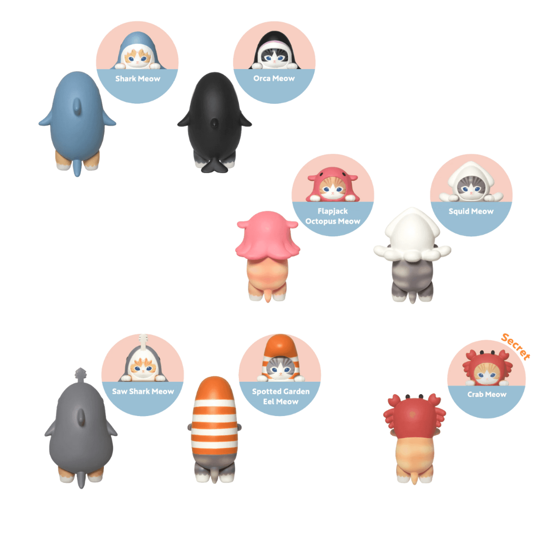 All Hippers Mofusand are sold blind, so you won’t know which figure you’ll get until you open the box. There are seven types in total: 6 regular - Shark Meow, Orca Meow, Flapjack Octopus Meow, Squid Meow, Saw Shark Meow and Stripe Garden Eel Meow, plus one special secret type Crab Meow.