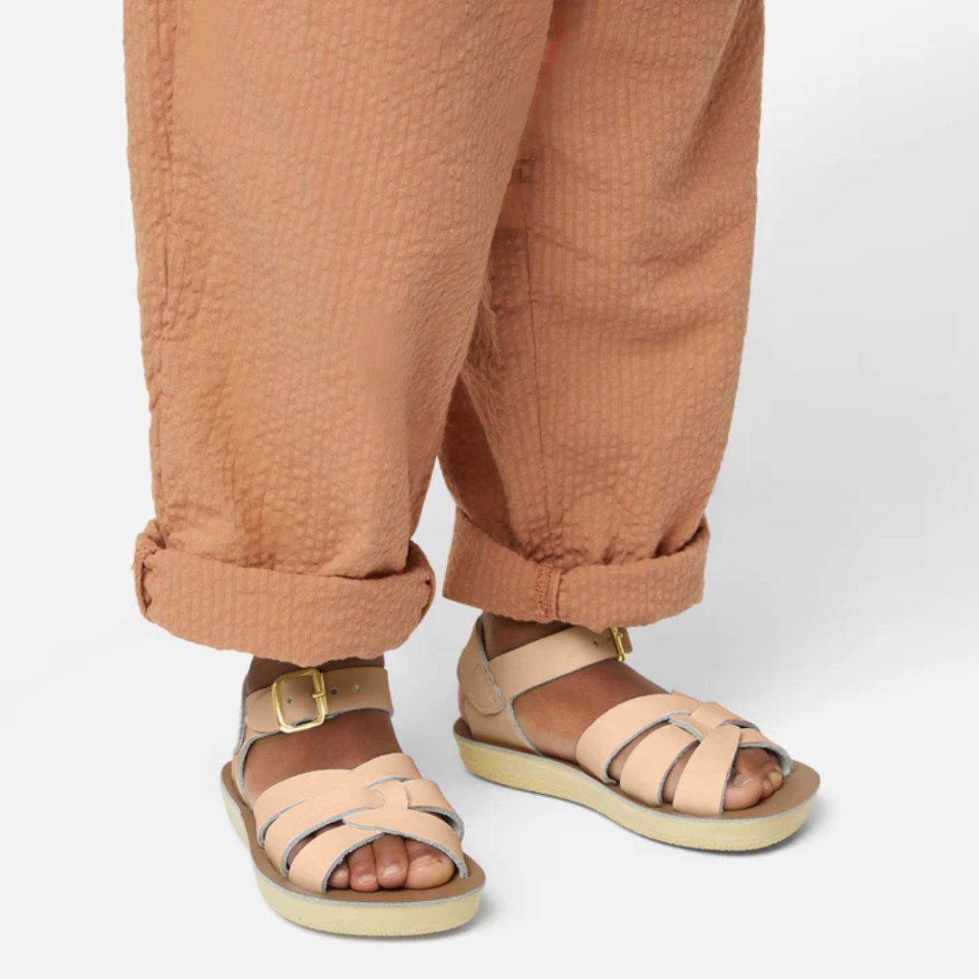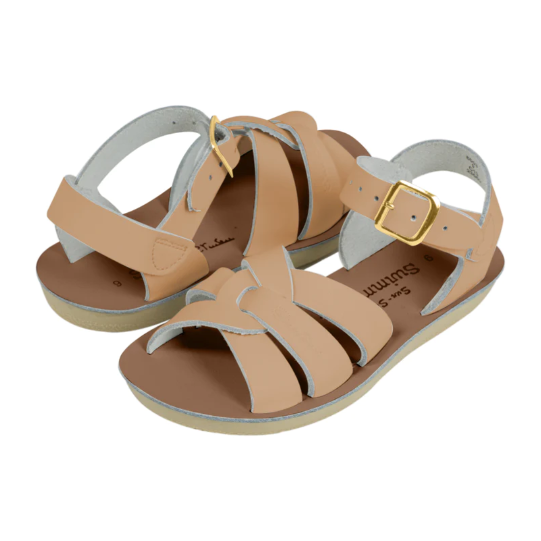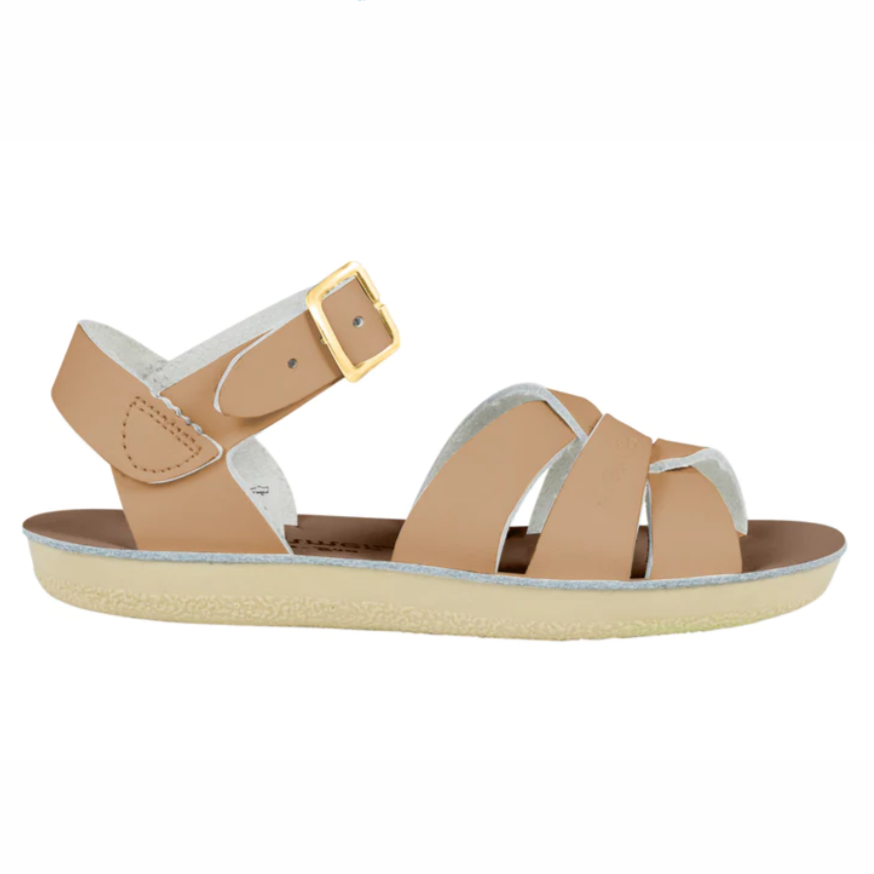 The Sun-San Swimmer sandal features a woven leather upper and adjustable ankle strap. It comes with rust proof buckles and can be worn in the water. Great for everyday or special occasions.
