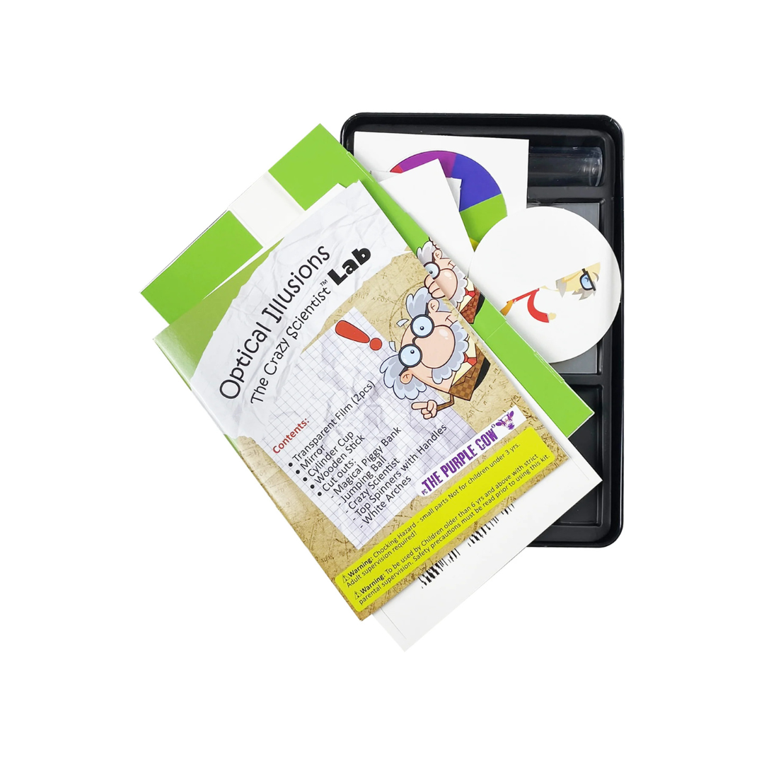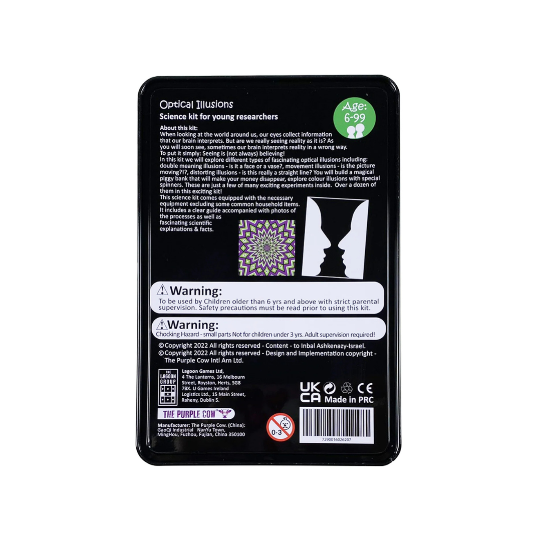 In this kit we will explore different types of fascinating optical illusions including: double meaning illusions - is it a face or a vase?, movement illusions - is the picture moving?!?, distorting illusions - is this really a straight line? You will build a magical piggy bank that will make your money disappear, explore colour illusions with special spinners. These are just a few of many exciting experiments inside. Over a dozen of them in this exciting kit!