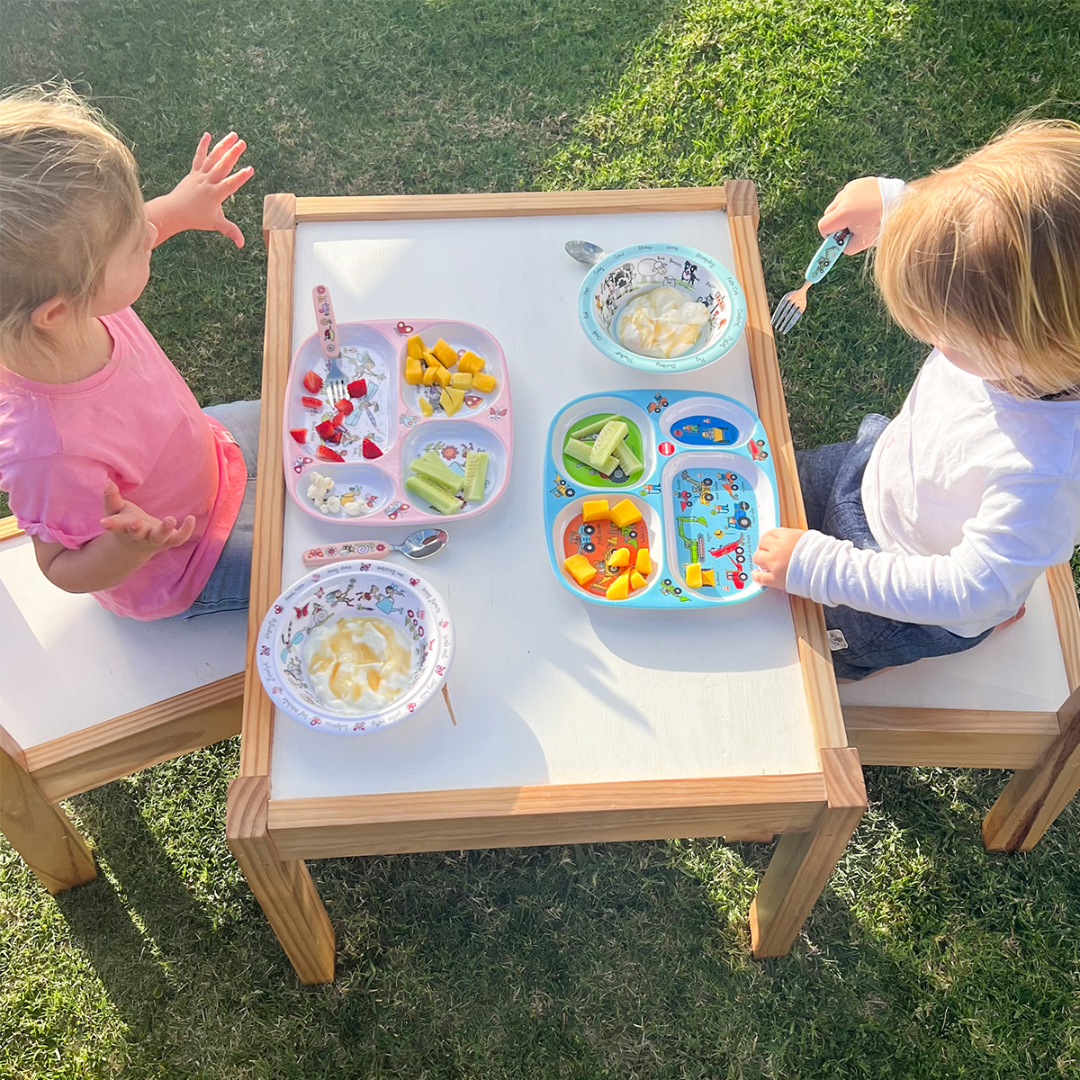 Melamine sectioned plate with 4 compartments featuring different scenes. Ideal for encouraging independent eating and makes mealtimes more enjoyable.