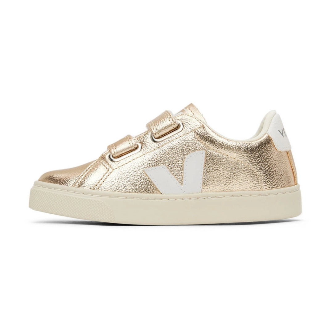 The Veja Esplar shoes shine in metallic gold leather with a subtle sheen, featuring a signature logo patch at the side, a round toe, and a contrasting heel counter. Designed with double velcro fastening, they’re perfect for kids to slip on and secure by themselves, while the branded insole and flat rubber sole ensure all-day comfort and support. Crafted from responsibly sourced bovine leather from southern Brazil and Uruguay, the material is locally tanned in workshops chosen for their high environmental standards, using compliant dyes and mindful water consumption. Made with sustainable components, including wild Amazonian rubber and lining created from recycled plastic bottles, this style blends eye-catching design with conscious craftsmanship.