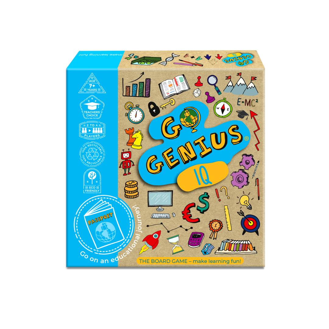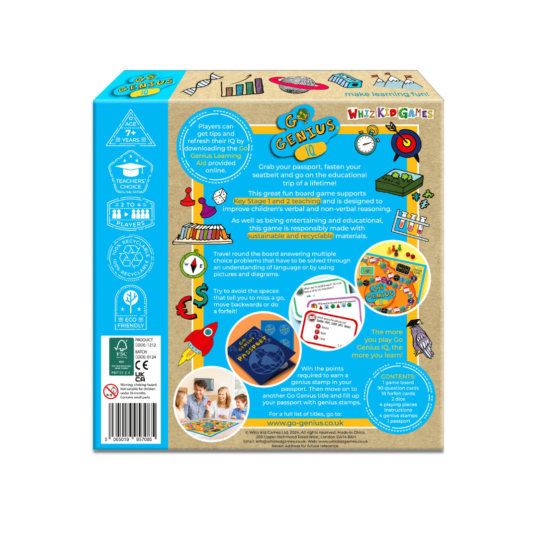 Grab your passport, fasten your seatbelt and go on the educational trip of a lifetime with this great fun board game. It supports Key Stage 1 and 2 teaching and is designed to help and improve children’s verbal and non-verbal reasoning. The aim of the game is to get as many points as possible. Players travel round the board answering multiple choice problems that have to be solved through an understanding of language of by using pictures and diagrams. They need to try and avoid the spaces that tell them to miss a go, move backwards or do a forfeit! Players who gain more than 15 points can put a genius stamp (provided) into their Go Genius passport (provided for children to personalise). Not everyone is a genius but the idea is the more you play the game, the more you learn. Once players have won the points required to earn a genius stamp for Go Genius IQ, they can then move on to another Go Genius title and fill up their passport with genius stamps! As well as being entertaining and educational, Go Genius IQ is responsibly made with sustainable and recyclable materials.